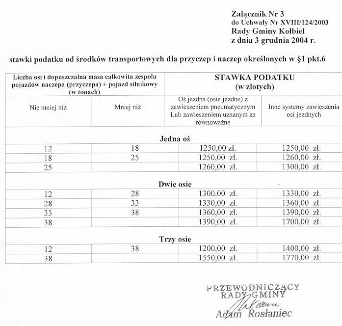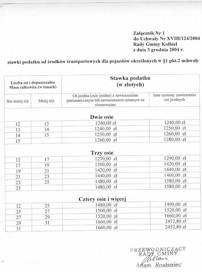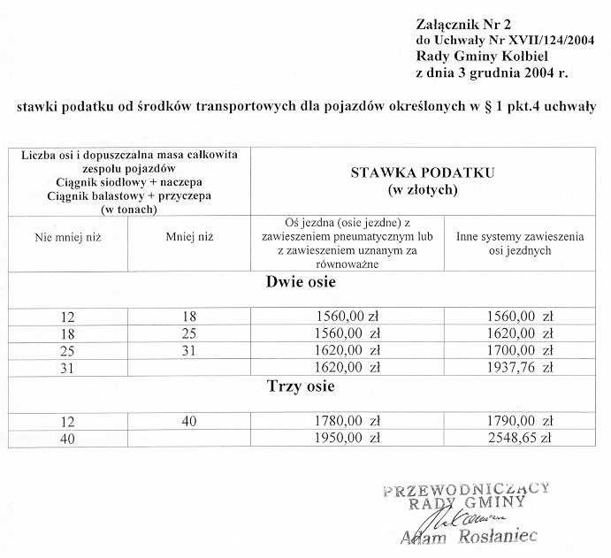 Uchwała Nr XVIII/124/2004 Rady Gminy Kołbiel z dnia 3.12.2004r. w sprawie określenia stawek podatku od środków transportowych